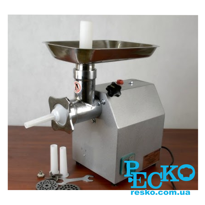 • Комплектація - два ножі, дві решітки з отворами 6 і 8 мм, насадки для ковбас Ø 19, 17, 12 мм, пластиковий штовхач, лоток для подачі м'яса